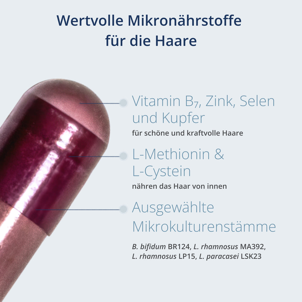 Kijimea Hair ist ein Nahrungsergänzungsmittel mit vier spezifisch ausgewählten Mikrokulturenstämmen. Kijimea Hair enthält Vitamin B₇ und die wertvollen Mineralien Zink und Selen, die zur Erhaltung normaler Haare beitragen. Zusätzlich enthält Kijimea Hair Kupfer, das zur normalen Haarpigmentierung beiträgt. Zink, Selen und Kupfer tragen außerdem dazu bei, die Zellen vor oxidativem Stress zu schützen. Kijimea Hair enthält zusätzlich die Vitamine B₁ und B₆, Pantothensäure, die Aminosäuren L-Methionin und L-Cystein, sowie Hirse-Extrakt.